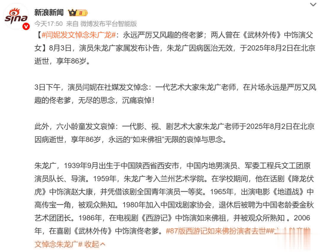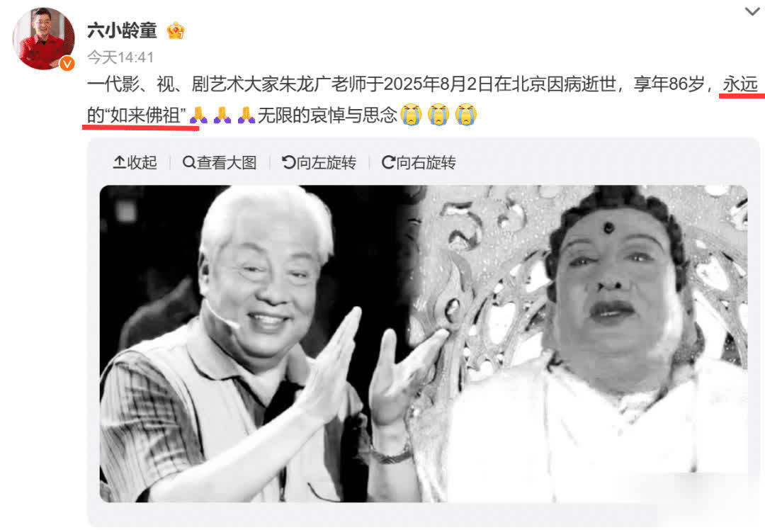 现如今朱广龙先生离世后,曾与其一起在86版《西游记》中出演过孙悟空的六小龄童,也发文哀悼称其是:永远的“如来佛祖”。