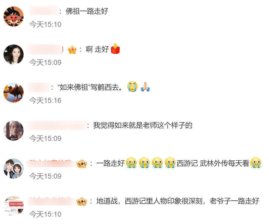 不少网友也在相关媒体报道的评论区表达了自己的哀思,纷纷评论“我觉得如来就是老师这个样子的”、“老人家一路走好”、“如来佛祖驾鹤西去”......