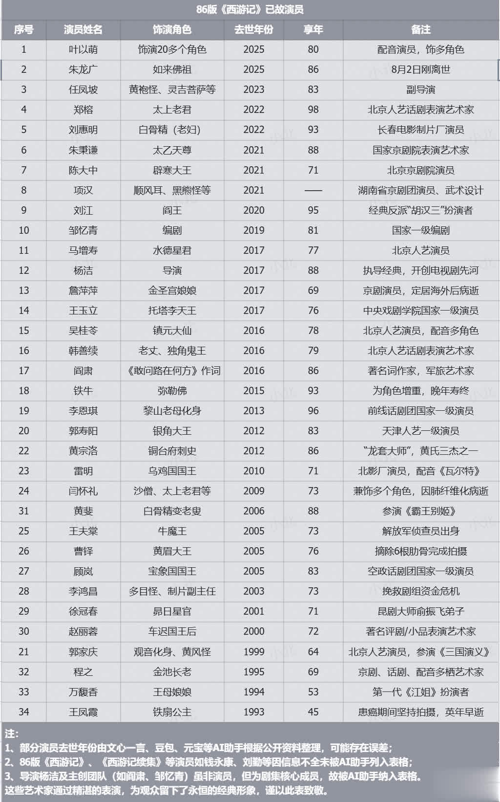 其实,在86版《西游记》播出的39年里,因病离世或是寿终正寝的演员就已经多达33位。