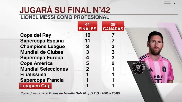 据ESPN数据统计,在梅西的职业球员的生涯中,共参加了41场决赛,赢得了其中的29场。